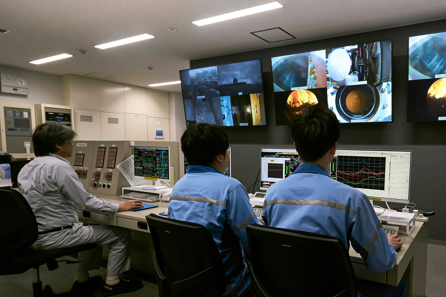 オペレーターが各設備の運転状況を監視したり、操作したりする場所です。監視カメラの映像や設備のデータが集められ、 24時間体制で監視が行われています。
