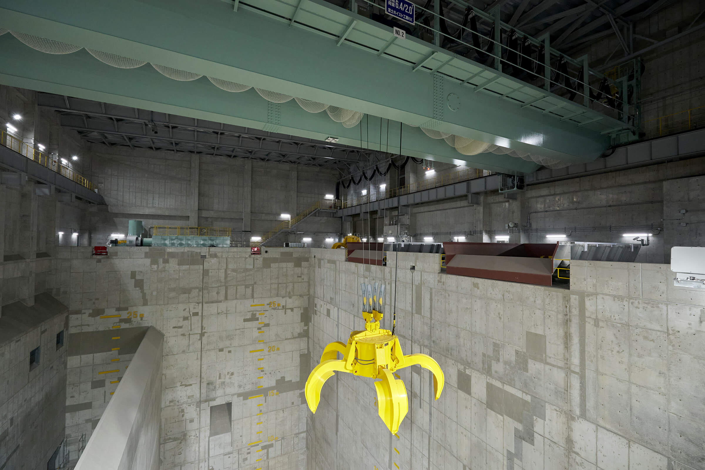 灰ピットは、焼却によって出た灰を一時的に貯留する場所です。灰クレーンで ダンプトラックに積んで最終処分場に運ばれます。