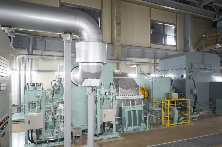 ボイラで発生した蒸気を利用し、電気を作る設備です。 蒸気の力でタービンの羽根車を高速で回転させ、発電機を動かすことで発電しています。
