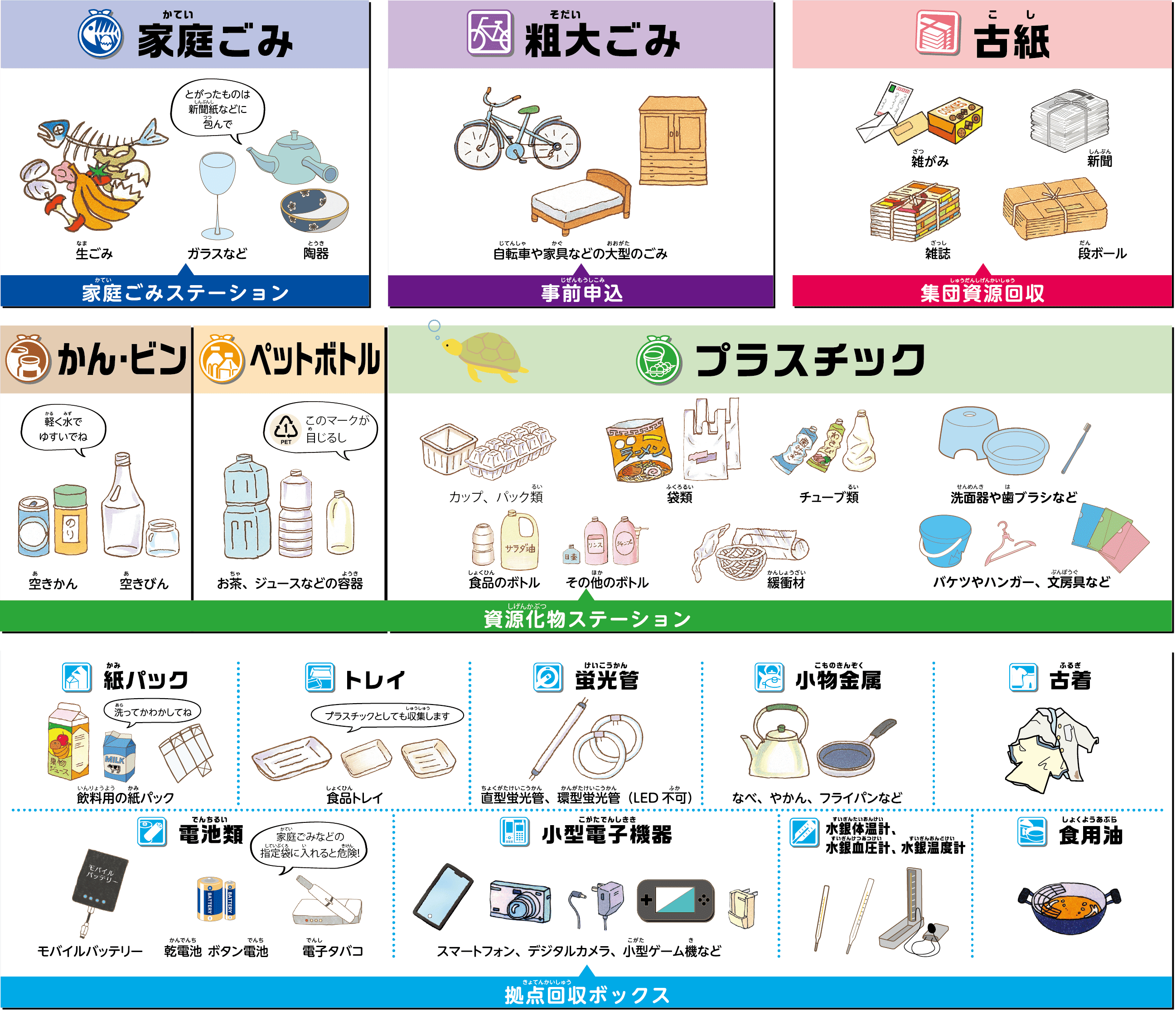 みんながまいにち出すごみの中には、リサイクルできる「資源(しげん)」がたくさんあるよ。もし分けずにすててしまうと、ほんとうはもういちどつかえるものがむだになってしまうんだ。一人ひとりがしっかり「資源(しげん) 」と「ごみ」を分けて、正しく出すことで、地球(ちきゅう)やまちをまもることにつながるんだよ!